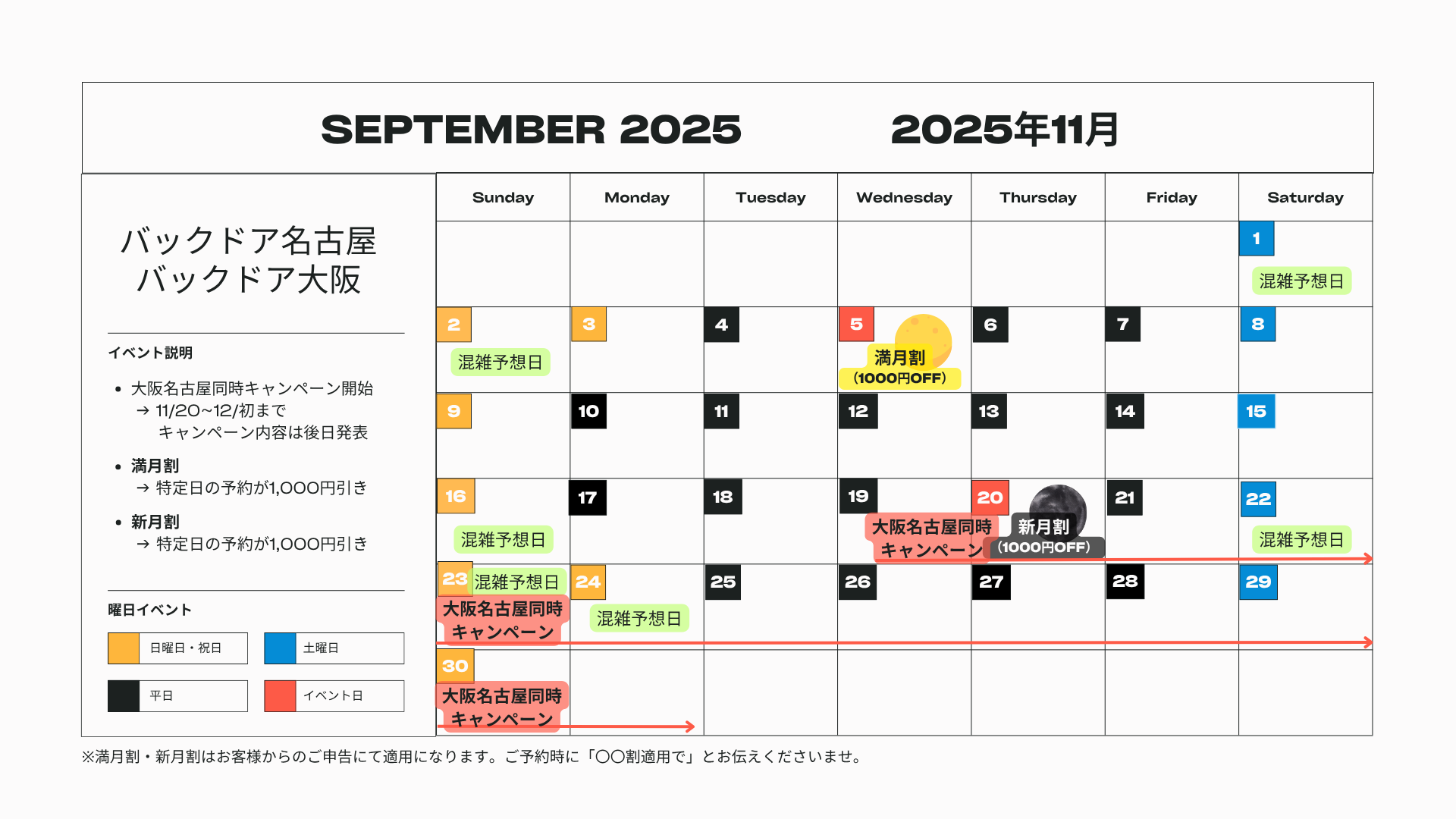 1月の満月割は11/5(水)、新月割は11/20(木)です。